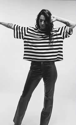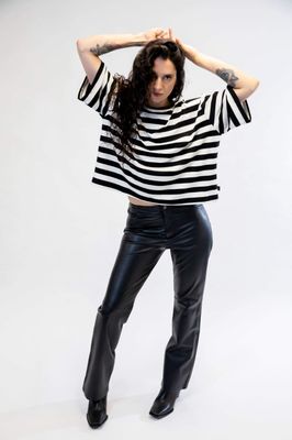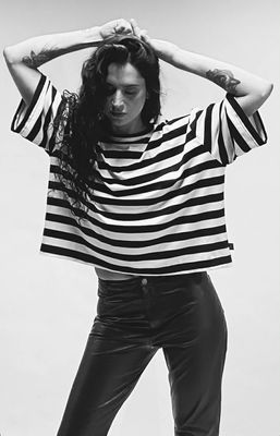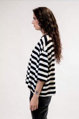 Worn here in a soft mid weight cotton black and an off white stripe.