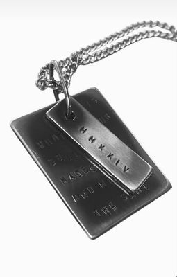 The larger oxidised tag is lightly blackened with a soft satin sheen, featuring the iconic text: