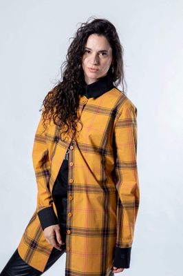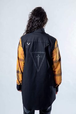 A striking fusion of craft, colour, and modern edge. The Legacy Shirt is cut in a premium Japanese cotton check in rich ember tones, contrasted with a sleek black cotton back panel featuring the signature JS chain crest.
