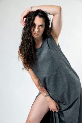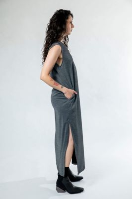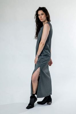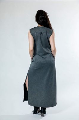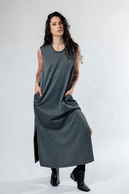 A fluid, silver–shimmer maxi dress designed to move with you. Cut in a midweight metallic knit that catches the light with a soft, understated glow, this piece blends ease with quiet evening glamour. The sleeveless silhouette, deep side splits and relaxed drape create a long, modern line — effortless by day, elevated by night. Wear it bare for a sleek minimalist look, or layer over trousers for a directional JS style.