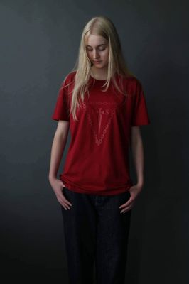 The Chain Dagger Tee is crafted in a rich 100% cotton cardinal red, featuring a tonal chain triangle motif with the iconic JS dagger at its centre. Subtle and refined, the print blends seamlessly into the fabric for a worn-in, heirloom feel rather than a bold graphic statement.
