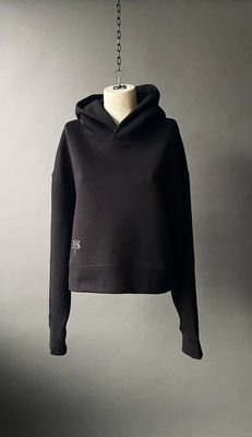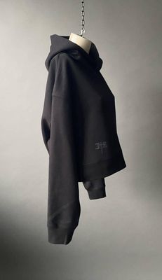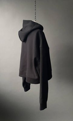 Cut in a mid weight structured 320gsm cotton fleece, this piece holds its shape while offering a sense of ease and warmth. The cropped silhouette is balanced by a dropped shoulder and a double-layered hood, adding weight and quiet structure.